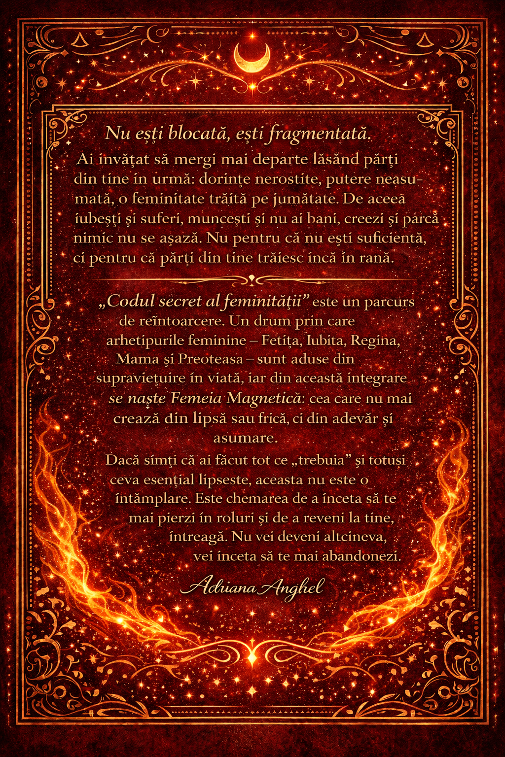 În fiecare femeie trăiesc arhetipuri vii, iar acestea nu sunt concepte teoretice și nici etichete simbolice, ci structuri reale de energie, emoție și identitate. Fetița, Iubita, Regina, Mama, Preoteasa și, în cele din urmă, Femeia Magnetică – Creatoarea – nu sunt personaje separate, ci părți active din tine, iar felul în care gândești, iubești, creezi, te sacrifici, te afirmi sau te retragi este influențat direct de starea în care se află acestea.