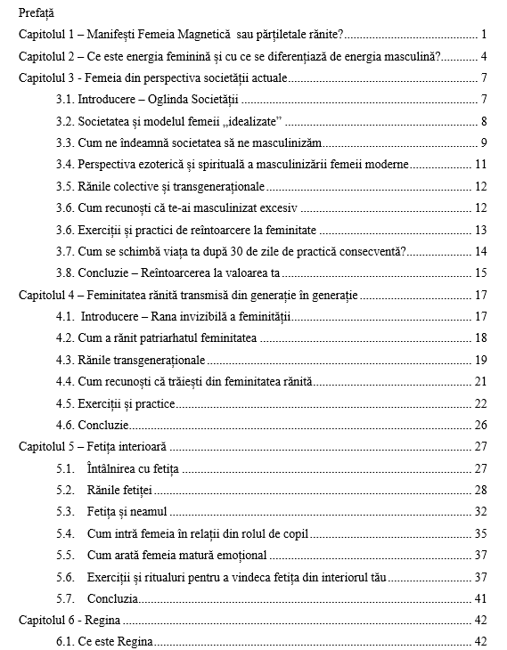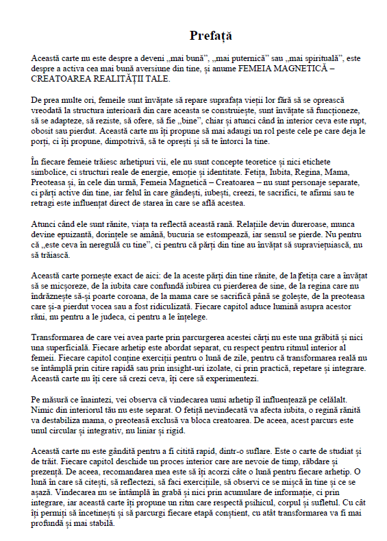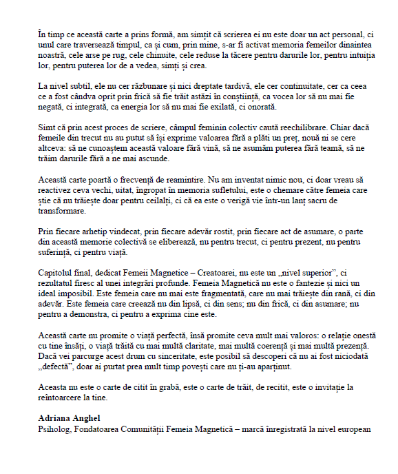 De prea multe ori, femeile sunt învățate să repare suprafața vieții lor fără să se oprească vreodată la structura interioară din care aceasta se construiește, sunt învățate să funcționeze, să se adapteze, să reziste, să ofere, să fie „bine”, chiar și atunci când, în interior, ceva este rupt, obosit sau pierdut. Această carte nu îți propune să mai adaugi un rol peste cele pe care deja le porți, ci îți propune, dimpotrivă, să te oprești și să te întorci la tine si sa descoperi Femeia Magnetica din interiorul tau.