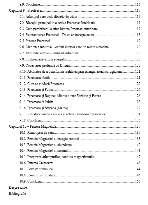 Această carte nu este gândită pentru a fi citită rapid, dintr-o suflare, este o carte de studiat și de trăit. Fiecare capitol deschide un proces interior care are nevoie de timp, răbdare și prezență, de aceea, recomandarea mea este să îți acorzi câte o lună pentru fiecare arhetip. O lună în care să citești, să reflectezi, să faci exercițiile, să observi ce se mișcă în tine și ce se așază, pentru ca vindecarea nu se întâmplă în grabă și nici prin acumulare de informație, ci prin integrare, iar această carte îți propune un ritm care respectă psihicul, corpul și sufletul. Cu cât îți permiți să încetinești și să parcurgi fiecare etapă conștient, cu atât transformarea va fi mai profundă și mai stabilă.