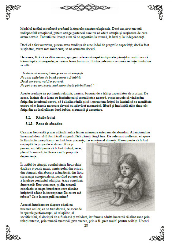 Această carte pornește exact de aici: de la aceste părți din tine rănite, de la fetița care a învățat să se micșoreze, de la iubita care confundă iubirea cu pierderea de sine, de la regina care nu îndrăznește să-și poarte coroana, de la mama care se sacrifică până se golește, de la preoteasa care și-a pierdut vocea sau a fost ridiculizată. Fiecare capitol aduce lumină asupra acestor răni, nu pentru a le judeca, ci pentru a le înțelege.