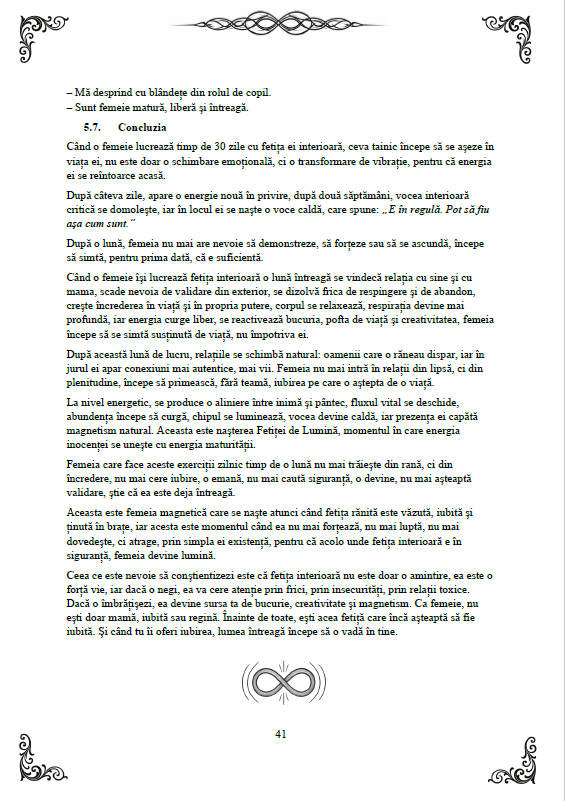 Această carte nu promite o viață perfectă, însă promite ceva mult mai valoros: o relație onestă cu tine însăți, o viață trăită cu mai multă claritate, mai multă coerență și mai multă prezență. Dacă vei parcurge acest drum cu sinceritate, este posibil să descoperi că nu ai fost niciodată „defectă”, ci doar ai purtat prea mult timp povești care nu ți-au aparținut.