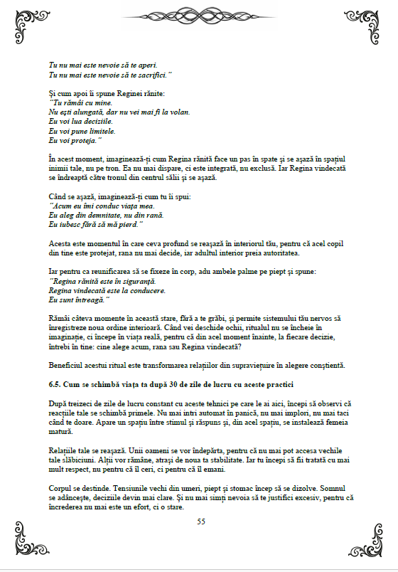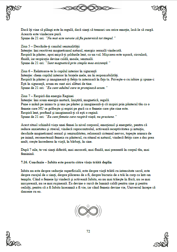 De aceea, pentru mine este important — și îți cer acest lucru cu toată asumarea — ca, după șase luni în care ai lucrat consecvent cu această metodă, să îmi spui cum ți s-a transformat viața, nu pentru validare, ci pentru adevăr. Vreau să știu ce s-a schimbat în felul în care te raportezi la tine, la corpul tău, la relații, la bani, la feminitatea ta. Vreau să știu ce s-a așezat, ce s-a limpezit, ce nu mai este la fel.