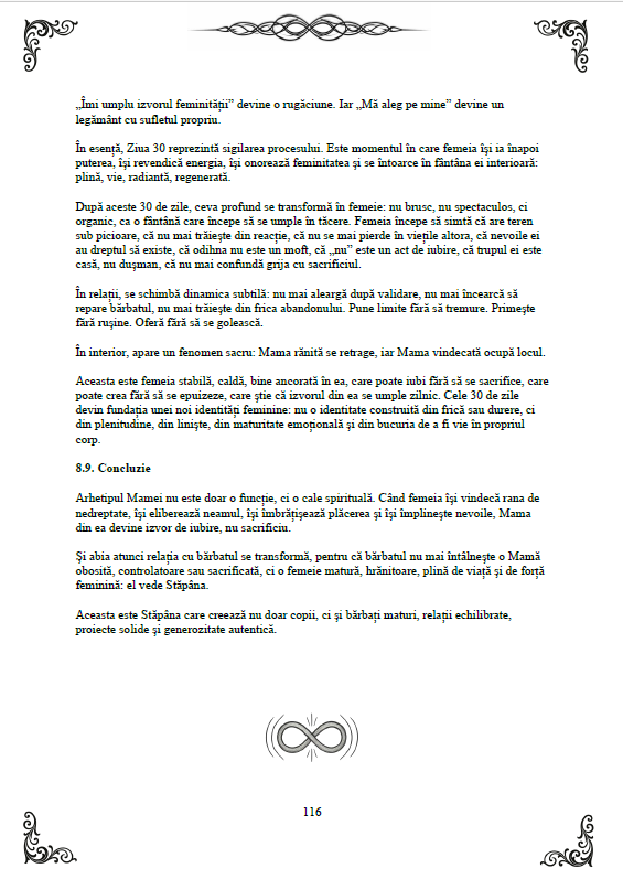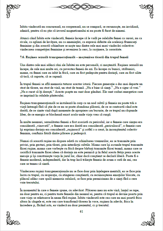 Simt că, prin acest proces de scriere, câmpul feminin colectiv caută reechilibrare. Chiar dacă femeile din trecut nu au putut să-și exprime valoarea fără a plăti un preț, nouă ni se cere altceva: să ne cunoaștem această valoare fără vină, să ne asumăm puterea fără teamă, să ne trăim darurile fără a ne mai ascunde, iar cu ajutorul acestei carti, ai acces la o poartă o frecvență de reamintire. Nu am inventat nimic nou, ci doar vreau să reactivez ceva vechi, uitat, îngropat în memoria sufletului, ca o chemare către femeia care știe că nu trăiește doar pentru ceilalți, ci că este o verigă vie într-un lanț sacru de transformare.